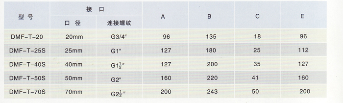 DMF—T型電磁脈沖閥為直通閥,其進出口中心為同一直線,其進氣口與儲氣管連接、出氣口與噴吹管連接,氣流,能提供符合要求的脈沖氣流。與氣箱脈沖袋式除塵器配套。 技術指標: 工作壓力:0 3-0 6Mpa 工作介質(zhì):清潔空氣 電壓:Dc24v/Ac220v 電流:800mA/60mA 使用壽命:100萬次或2-3年。 DMF-T電磁脈沖閥型號規(guī)格表:(mm)